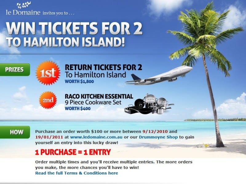 Prizes: the first eligible entry (as defined in Condition 5) randomly drawn electronically from all eligible entries received during the relevant promotional period will win the first prize: Two (2) VirginBlue adult return economic tickets to Hamilton Island, Queensland, Australia from one of the following major cities: Sydney, Melbourne or Brisbane (the prize winner and their travelling companion, if applicable, must travel together between 13/02/2011 and 31/03/2011) valued at up to AUD$1,800.00 (Recommended Retail Price including GST). The second eligible entry randomly drawn electronically from all eligible entries received during the relevant promotional period (excluding the first prize winner) will win the second prize: One (1) Raco 9 Piece Cookware Set valued at AUD$400.00 (Recommended Retail Price including GST)