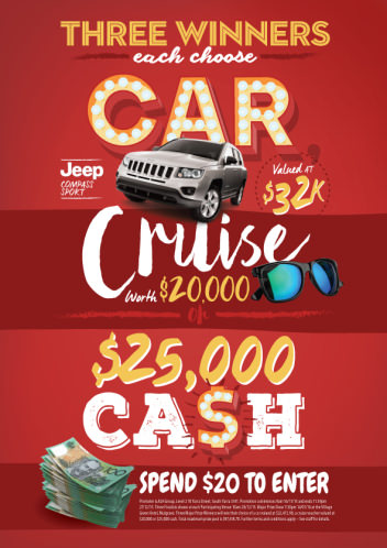 We’re giving three lucky winners the chance to choose between a Jeep Compass Sport valued at $32,000, a Cruise worth $20,000 or $25,000 cash.