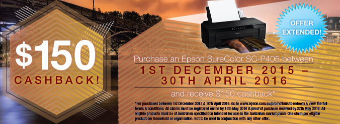 Purchase a new Epson SureColor SC-P405 printer from selected Epson Resellers between 1 December 2015 and 30 April 2016 and claim the following cashback: