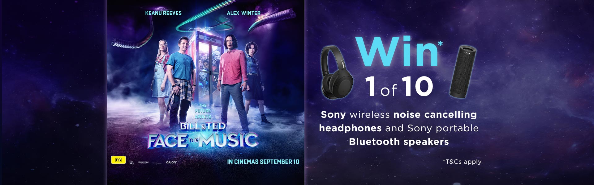 Book your tickets to see Bill & Ted Face the Music for your chance to win 1 of 10 Sony Wireless Noise Cancelling Headphones and Sony Portable Bluetooth® Speaker valued at $699.90.