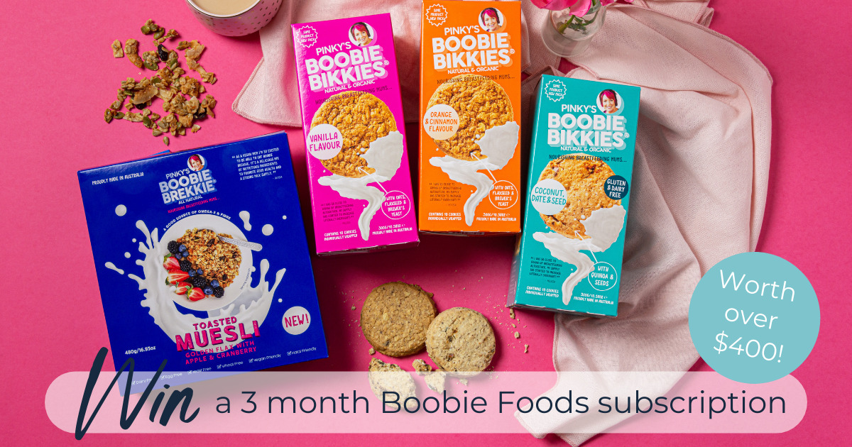 https://tellmebaby.com.au/product-reviews/review-to-win-boobie We’re giving away a 3 month subscription to Boobie Foods, valued at over $400! You’ll get 4 boxes of Boobie Bikkies and 3 boxes of Boobie Brekkie each month, for 3 months, delivered straight to your door.