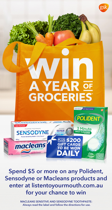 At IGA , Foodland or Foodworks, Spend $5 or more on any Sensodyne, Polident or Macleans products to Win a year's worth of groceries valued at $8000.