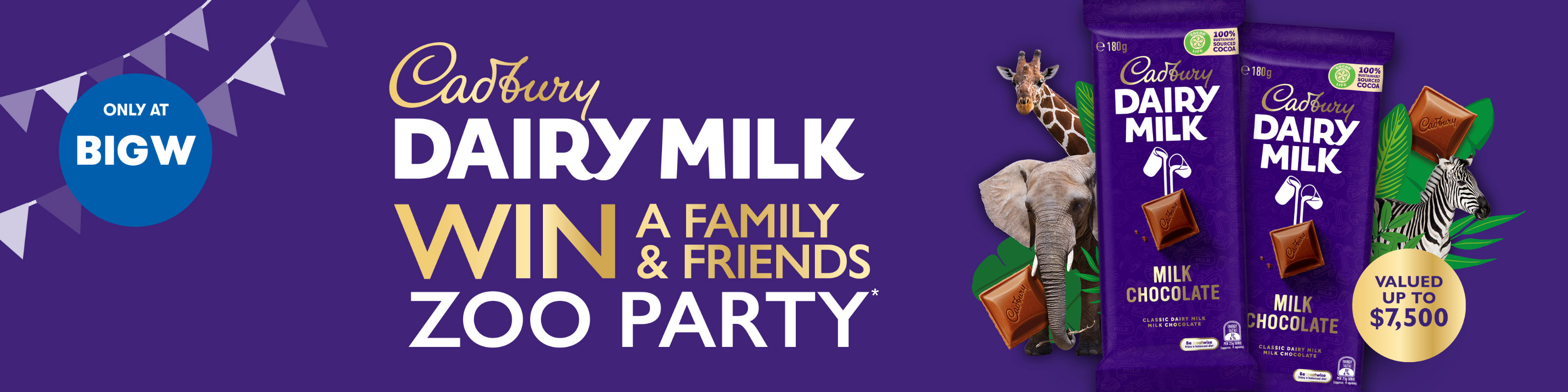 The prize is a Cadbury Dairy Milk Zoo Party Pack for the winner to have a party at their nearest available participating Zoo (as determined and advised by the Promoter) for up to 50 people (subject to venue capacity limits), valued at up to $7,500. Any children attending will be included in the total head count, and each child must be accompanied at all times by an adult.