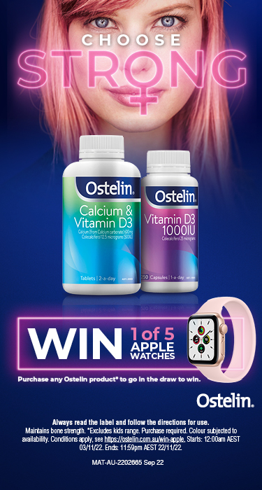 AU residents 18+ only. Between 12.01am (AEDT) 3/11/22 & 11.59pm (AEDT) 22/11/22, buy any Ostelin Vitamin D capsules 1000 IU (250, 130 or 60) / 50ml liquid; Vitamin D & Calcium tablets (250 or 130) / chewable tablets (60) / caplets (60); CAL-DK2 tablets (60 or 30); or Bone Strength Plus Iron Film Coated tablets (60) / Magnesium Film Coated tablets (120) / Collagen Support film coated tablets (120) from a participating Terry White Chemist (incl. online), visit