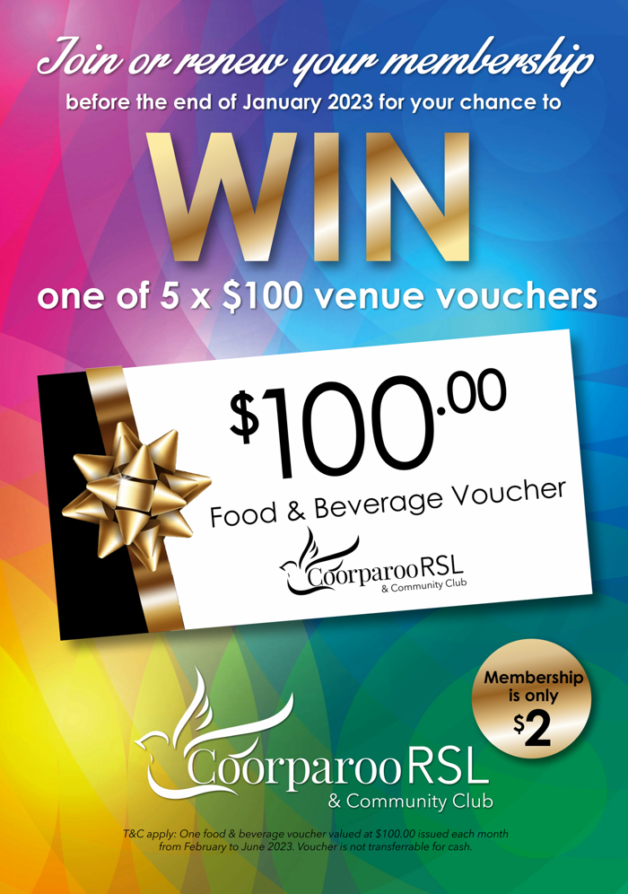 Topic: Coorparoo RSL - Win 1/5 $100 F & B Vouchers/Join or Renew Memb by 31/1/23 (Read 193 times) (Replies 0 posts)