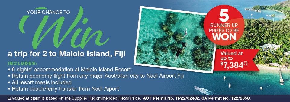 21. The first entry drawn will win a Major Prize for a trip for 2 (two) to Malolo Island, Fiji, which includes: (a) Six (6) nightsâ accommodation at Malolo Island Resort, for two (2) people; (b) Return economy flights for two (2) people from any major Australian city to Nadi Airport Fiji including 23kg luggage allowance, subject to flight and booking availability;