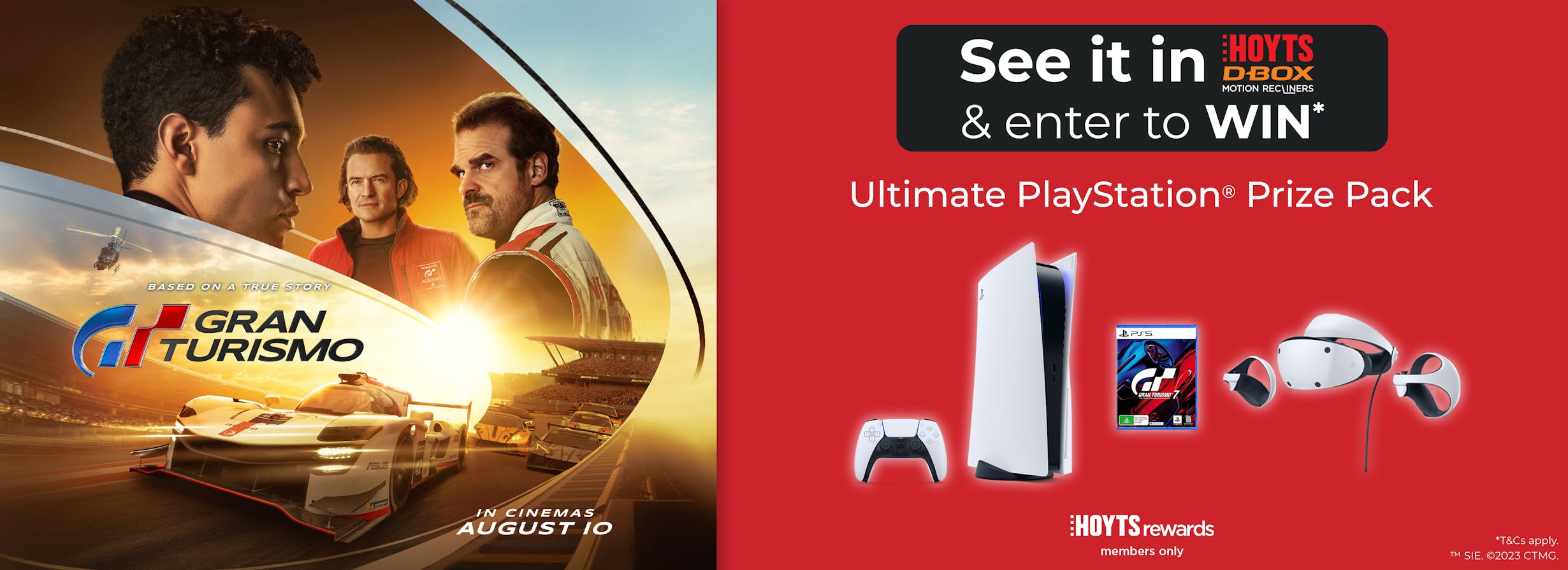 We’re giving HOYTS Rewards members the chance to win* the ultimate PlayStation® Prize Pack when you book tickets to see Gran Turismo: Based on a True Story in HOYTS D-BOX before 11:59PM AEST Sunday September 10 2023.