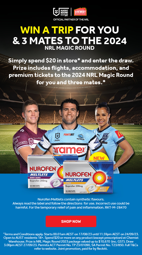 Spend $20 or more in any single transaction (in store or online, excluding prescription items) for your chance to WIN an NRL Magic Round Experience.https://www.chemistwarehouse.com.au/competitions/nurofen-nrl-23Terms and Conditions: