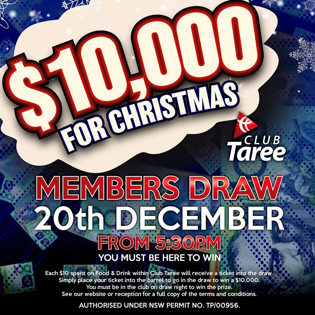 $10,000 FOR CHRISTMAS Starting Friday 1st September 2023 Members Draw Drawn : 20th December Each $10 spend on food and drinks within Club Taree will receive a ticket into the draw. Simly place your ticket into the barrel to go into the draw to win $10,000. You must be in the club on the draw night to win the prize. Authourised uner NSW Permit No.TP/00956
