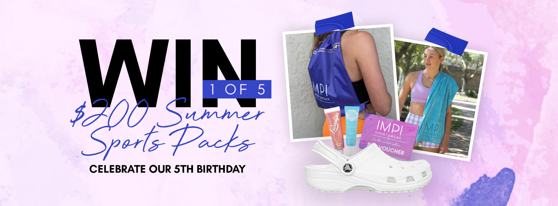 The five winner prize pack includes 1x IIMPI Gift Voucher $75 . 1x IMPI Active Towel $14.9, 1x IMPI Spike Bag, x1 Bondi Sands Sunscreen. 1 Lanolip and x1 Crocs