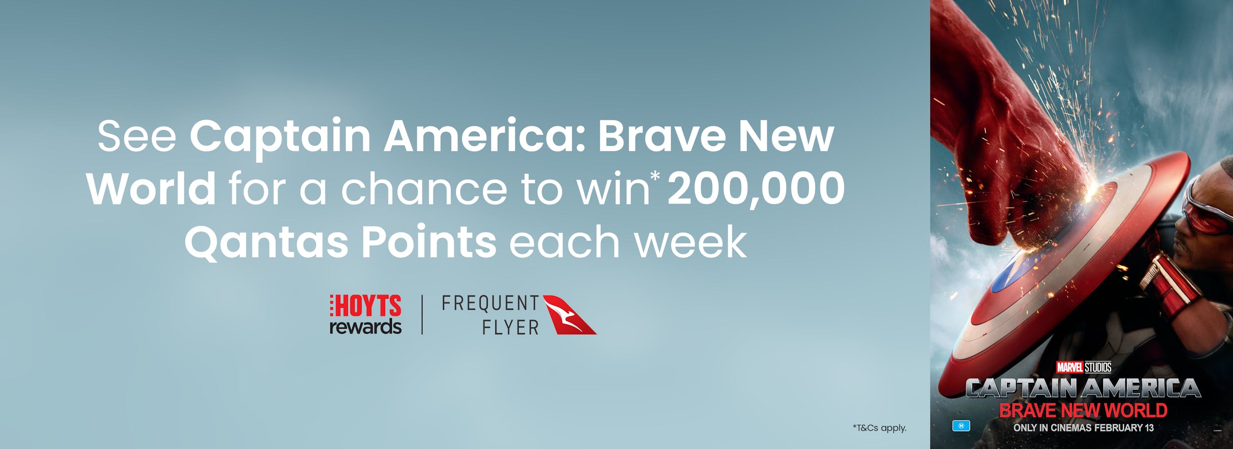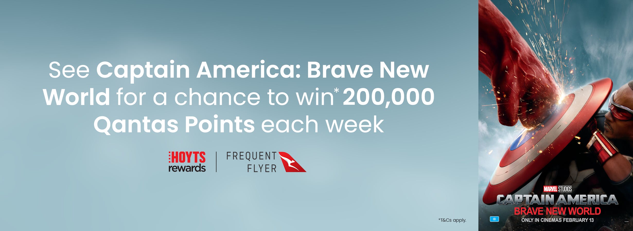 See Captain America: Brave New World at HOYTS between February 11, 2025 – March 11, 2025, and Make sure your Qantas Frequent Flyer account is linked to your HOYTS rewards membership.