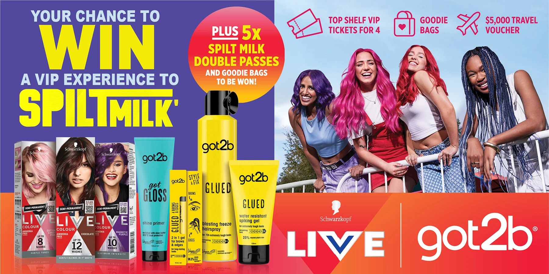 Purchase any Live Colour or got2b product for your chance to win a Spilt Milk VIP Experience.