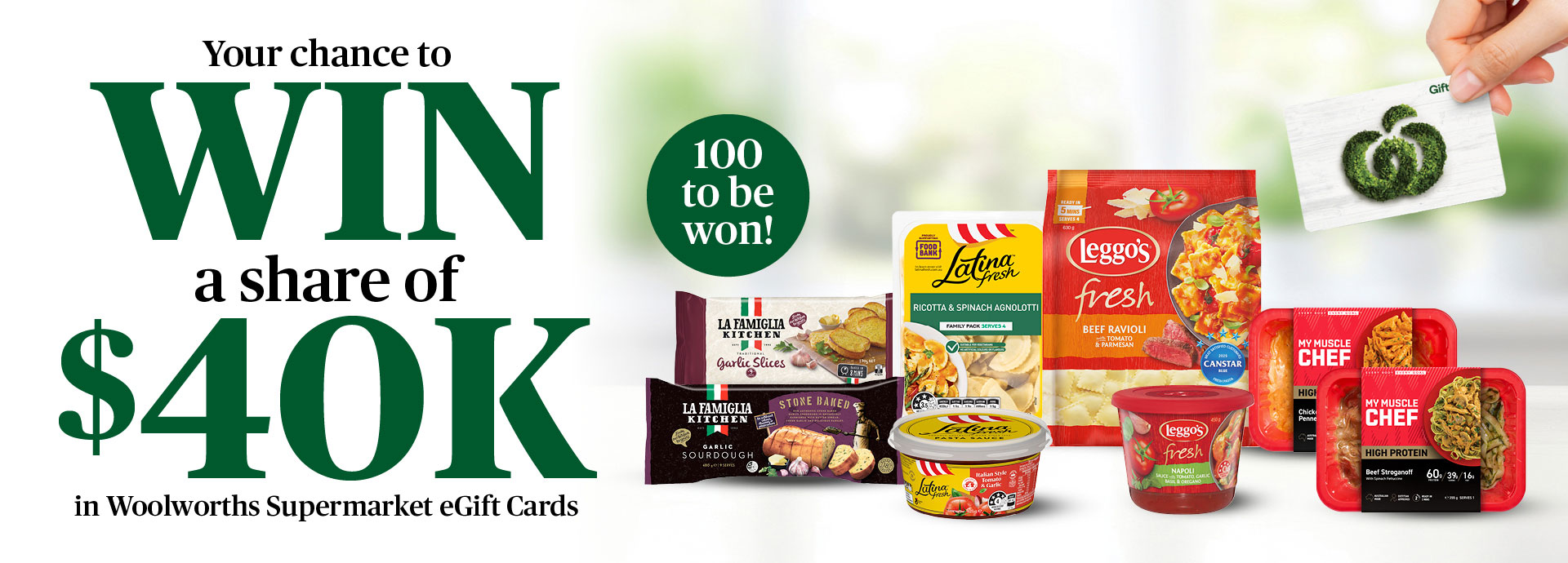 Further prize details: The Woolworths Supermarket eGift Cards will be sent to the winner’s email address within 30 days of the notification. Woolworths Group Limited ABN 88 000 014 675 is the issuer of the Woolworths Supermarket eGift Card. Woolworths Supermarket eGift Cards have no expiry date and are redeemable in store and online at Woolworths Supermarket stores only. For a list of participating stores and full Gift Card Terms and Conditions visit woolworths.com.au/giftcards. Any ancillary costs associated with redeeming the Woolworths Supermarket eGift Card are not included. Any unused balance of the Woolworths Supermarket eGift Card will not be awarded as cash. Redemption of the Woolworths Supermarket eGift Card is subject to any terms and conditions of the issuer including those specified on the Woolworths Supermarket eGift Card.