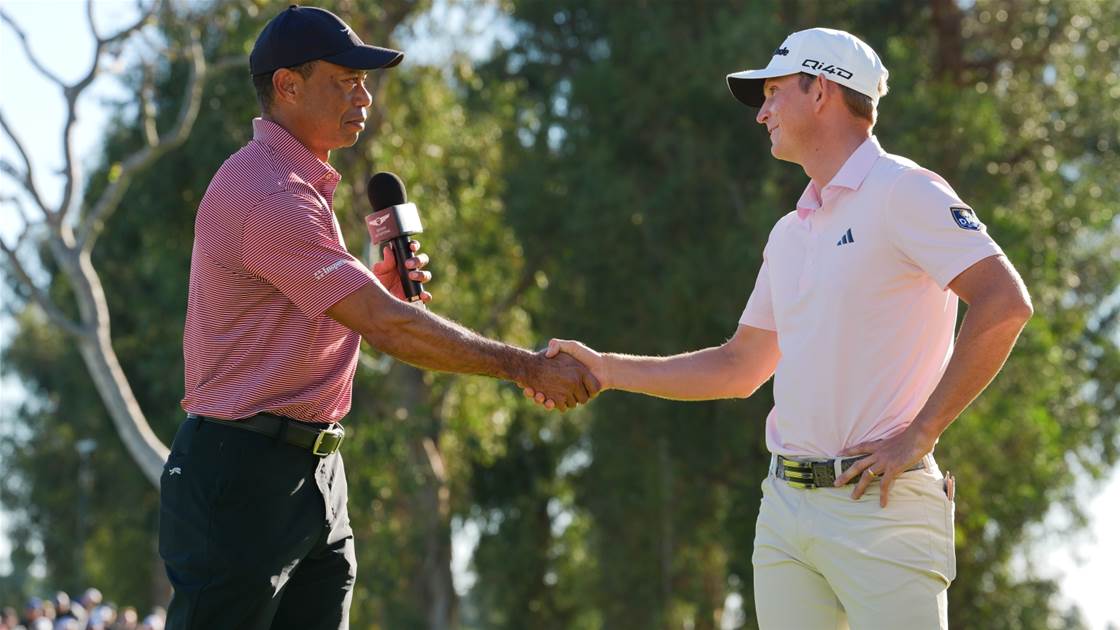 Jacob Bridgeman is congratulated by Tiger Woods after his maiden PGA Tour win over the weekend. Send us your caption to go with this image, and you could WIN!