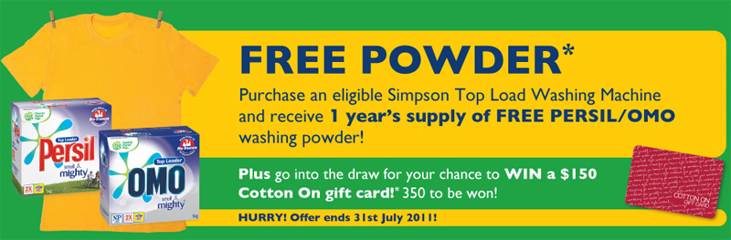 v.only lay-bys that have been paid in full by Sunday 31 July 2011 are eligible for the Cotton On Gift Card. PLEASE NOTE: Purchasers of SWT552SA, SWT605SA, SWT802SA, SWT902SA, SWT955SA, 36S550N, 36S605N, 22S750N, 22S950M, SWT554, SWT604, SWT704, SWT754, SWT954 models for Government and Commercial contract sales, second quality (T2) and auction goods are excluded from this promotion. SECOND QUALITY GOODS (T2). If your appliance Serial Number has “A”, “B”, or “C” before it, you will not be entitled to claim;