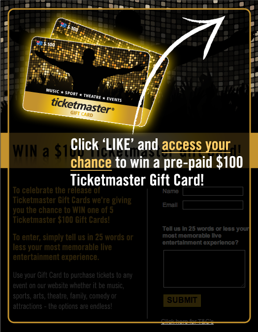 https://www.facebook.com/TicketmasterAU/app_195646697137509Win 1 of 5 Ticketmaster Gift Cards