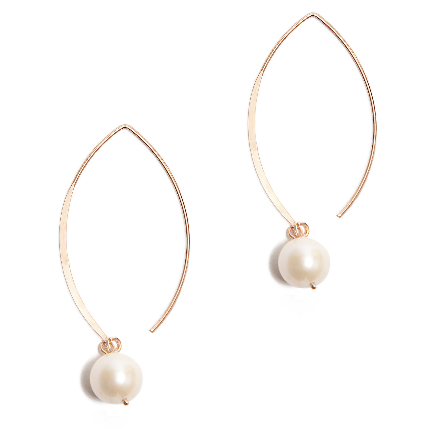 Delicate white pearls hang from elegantly curved ear wires, giving these earrings an ultra modern touch. The rose gold plating adds an extra sun-kissed glow to your cheeks. 8mm cultured pearl, rose gold plating, 925 silver base. Approximately 2.1 inches long.