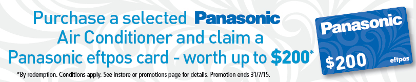 Receive a Panasonic eftpos card worth up to $200 when you purchase a selected Panasonic Air Conditioner.