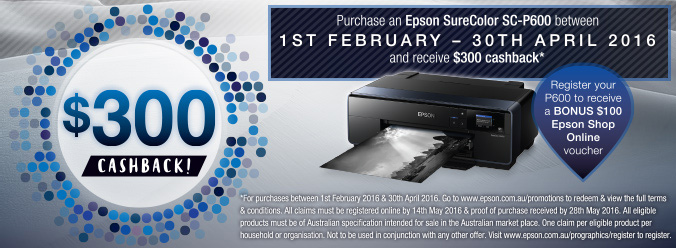 Purchase a new Epson SureColor SC-P600 printer from selected Epson Resellers between 1 February 2016 and 30 April 2016 and claim the following cashback: