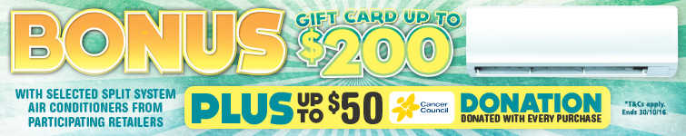 Retravision endeavours to ensure that all items are available for the life of the eDM or until sold out. Not all products are available at all stores or online; stock subject to availability. Some items may need to be specially ordered. We reserve the right to correct errors or misprints. *Terms and conditions apply. Gift card/donation amount depends on eligible product purchased. Starts 30/9/16. Ends 30/10/16. Open to AU res. 18+. Commercial/business transactions are ineligible. Max 3 claims/donations made per person. Gift card valid at store of purchase. See narta.com.au/promotions for full terms and conditions.‡Fully Installed Terms & Conditions; Includes standard back to back installation with outdoor unit at ground level (single storey). Also includes: electrical wiring up to 3.5kW to local power supply if approved by manufacturer (excludes Fujitsu). Above 3.5kW back to meter box (maximum 10 metres). Installation to be within a 20km radius of store. Delivery not included. This offer applies to metropolitan area only. Additional charges will apply in regional areas. Any additional cost to be paid by the customer.