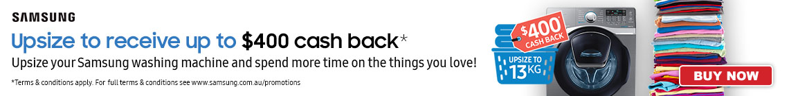 By redemption. Terms and Conditions apply. Purchase a participating Samsung washing machine between 9:00 am (AEST) on 28 July and 11:59 pm (AEDT) on 4 October 2016 to be eligible to receive up to $400 cash back. Banners can go up now and come down on the 4th October.