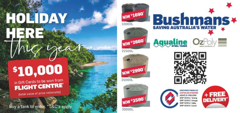Bushmans & OzPoly’s Autumn Travel Promotion 2021 “Holiday Here This Year” gives our customers a chance to WIN Flight Centre Gift Vouchers when buying a Bushmans, OzPoly or Aqualine tank. There is one 1 National Prize of a Gift Voucher from Flight Centre to the value of $5000 to be won OR one of 5 Prizes of a Gift Voucher from Flight Centre to the value of $1000 (5x$1000) to be won. The tank(s) must be purchased between 01/03/21 – 31/05/21 to be eligible to enter the draw, entries received after 14/06/21 will be deemed invalid. The winner will be drawn on 18/06/21. No rain checks.