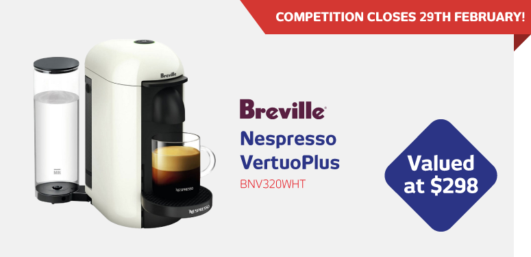 The prize is 1 x Breville Nespresso VertuoPlus Coffee Machine in White (BNV320WHT) valued at $298.
