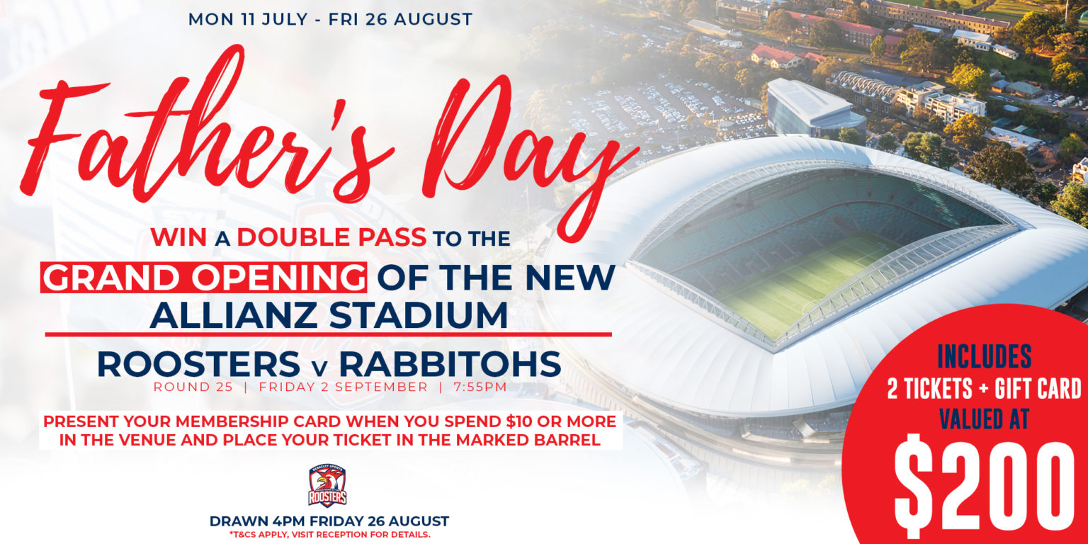 We are giving away two tickets to the grand opening of the new Allianz Stadium, to watch the Roosters v Rabbitohs RD 25 game, for one lucky Father this year!