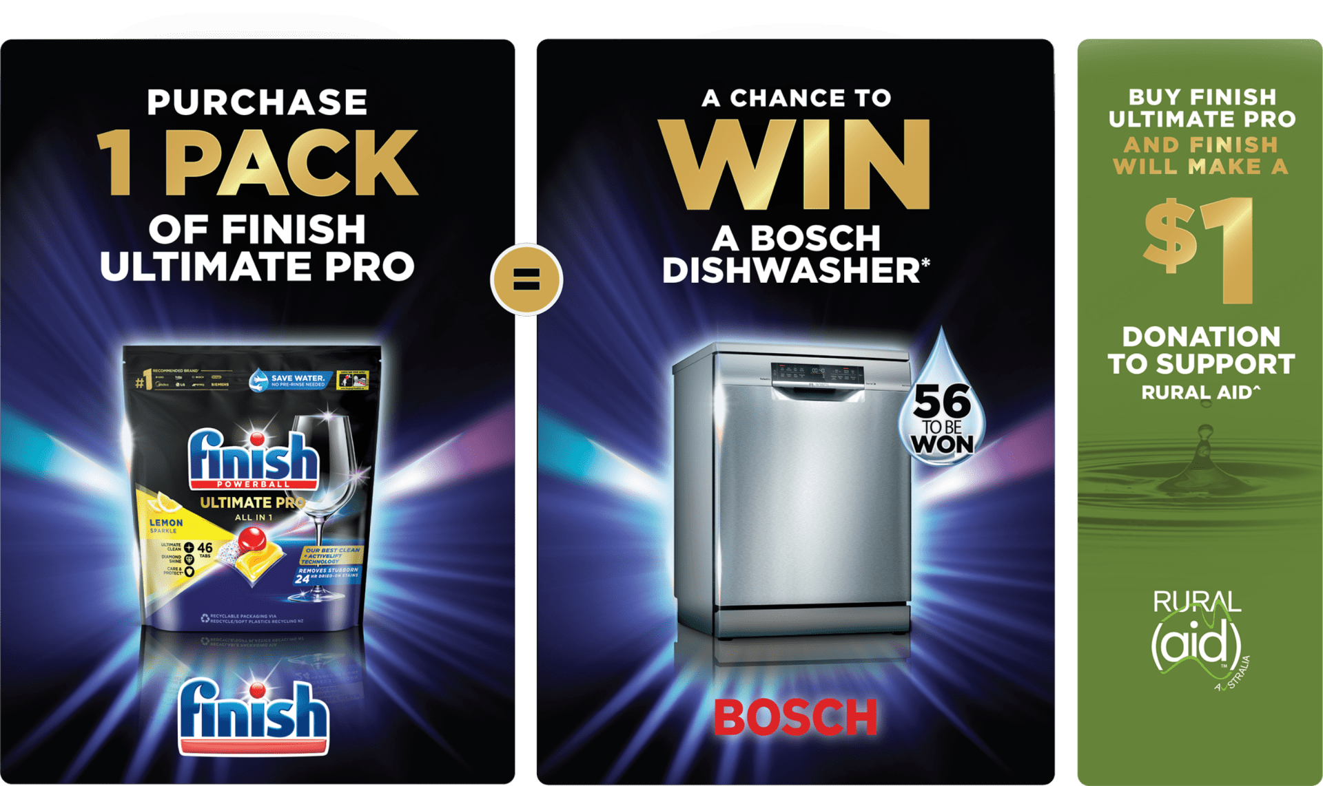https://www.finishgiveaway.com.au/All valid entries submitted will be eligible to win one (1) of fifty-six (56) Bosch dishwashers (model no. SMS6HAI01A) valued at AU $1,599.00 RRP each (including GST) (each a “Prize”). Colours may vary depending on availability. The Promoter takes no responsibility for any variation in the value of a Prize.