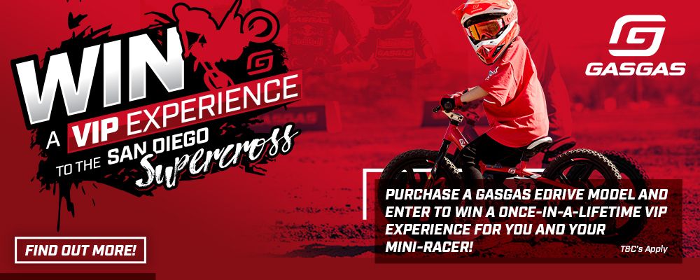 Purchase a GASGAS eDrive model before December 23rd and enter to WIN a once-in-a-lifetime VIP experience for you and your mini-racer! A 5-day VIP experience to the 2023 SAN DIEGO SUPERCROSS! Flights, Accommodation, and Transfers are covered for two adults and one child.