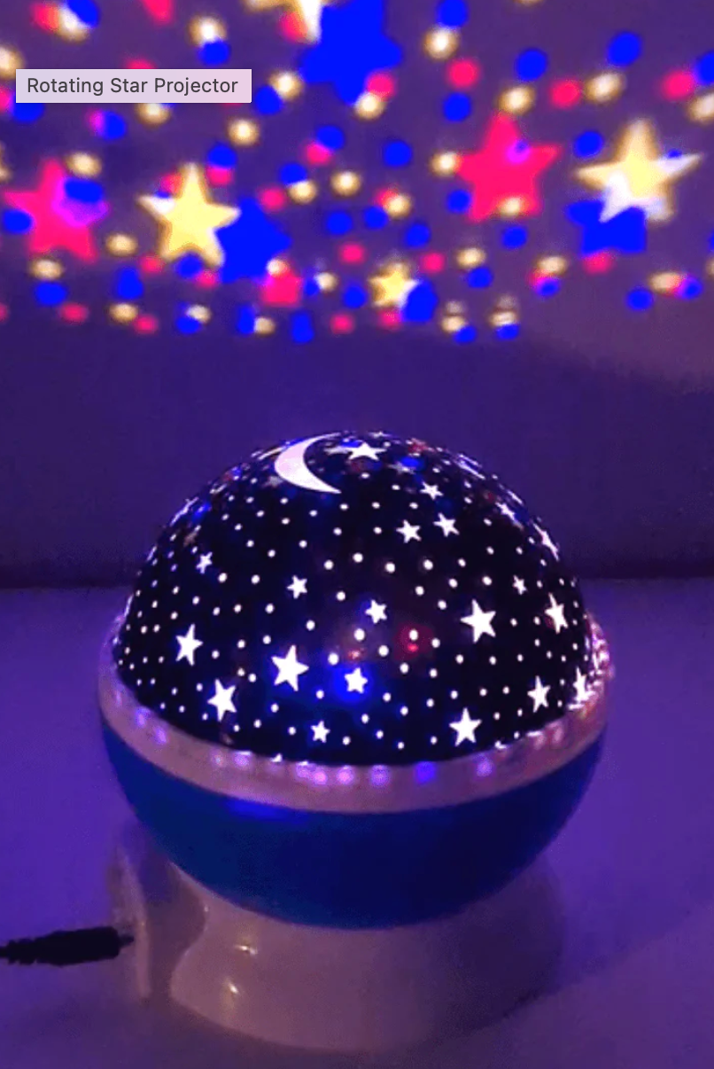 The rotating star projector magically takes you to the night sky. Use it as a projector to shine stars onto the walls and ceiling (or even better, a dark tent!).