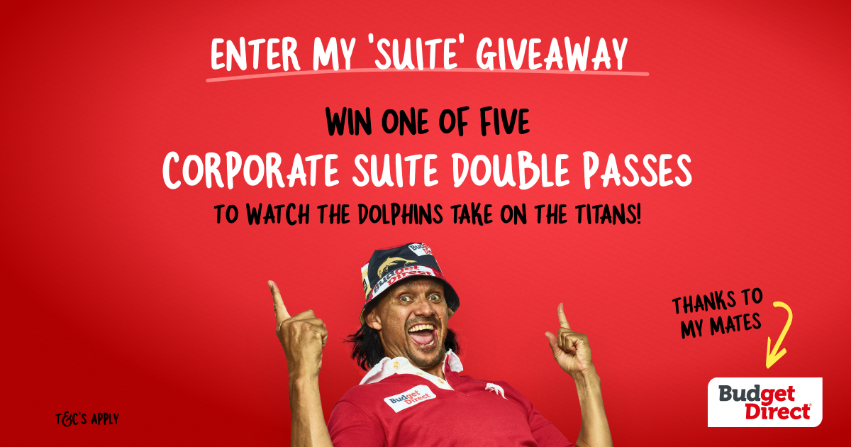 I happen to have quite the hook up with my legend of a sponsor Budget Direct. I’ve convinced them to lend me their corporate suite so that I can give you the chance to be one of five lucky ducks (or dolphins) who will win a double pass for you and your mate to watch the Dolphins take on the Titans at Lang Park on Sunday 23rd April, 2pm.