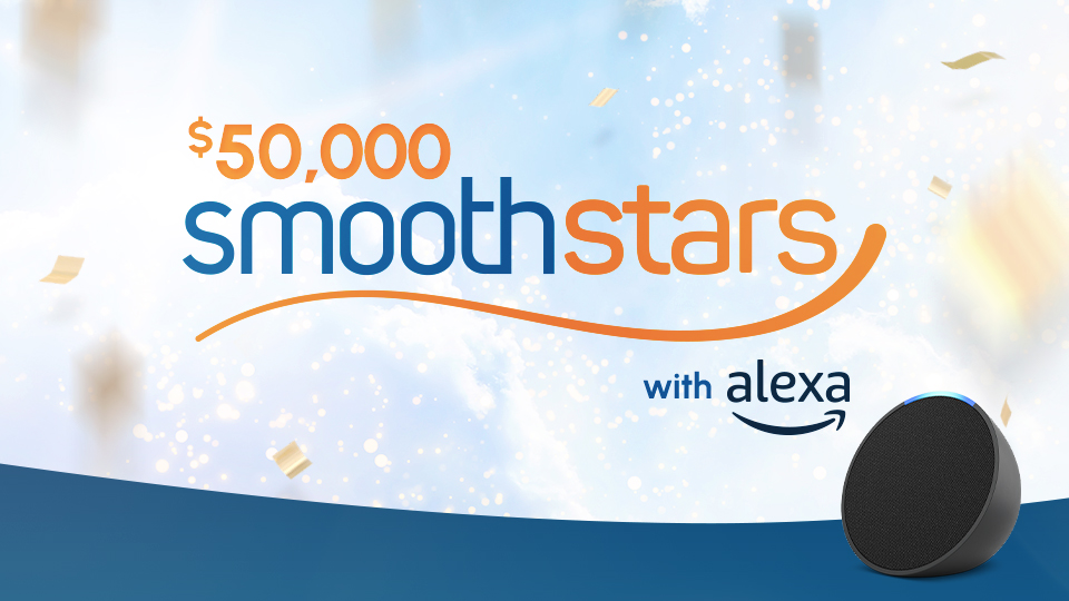 Your first chance to play Smooth FM's $50,000 Smooth Stars with Amazon Alexa is 8.30am Monday in The More Music Breakfast Show, and then all across your day til 6pm, on Smooth FM.