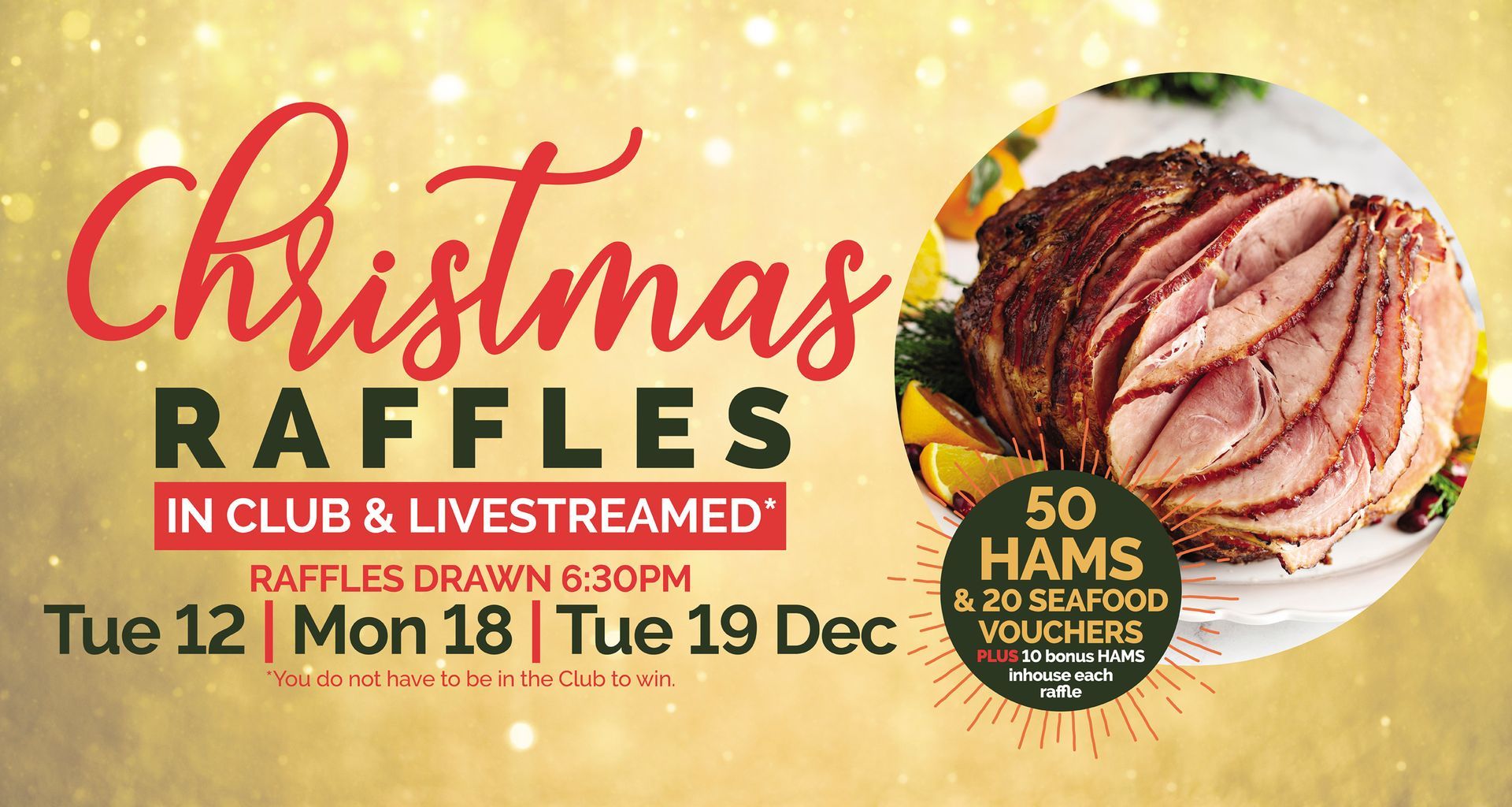 50 Hams & 20 Seafood Vouchers each raffle - PLUS 10 extra Hams each raffle in house!