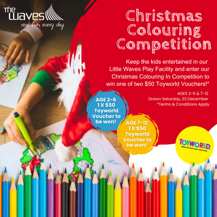 Keep the kids entertained in our Little Waves Play Facility and enter our Christmas Colouring In Competition to win one of two $50 Toyworld Vouchers!*