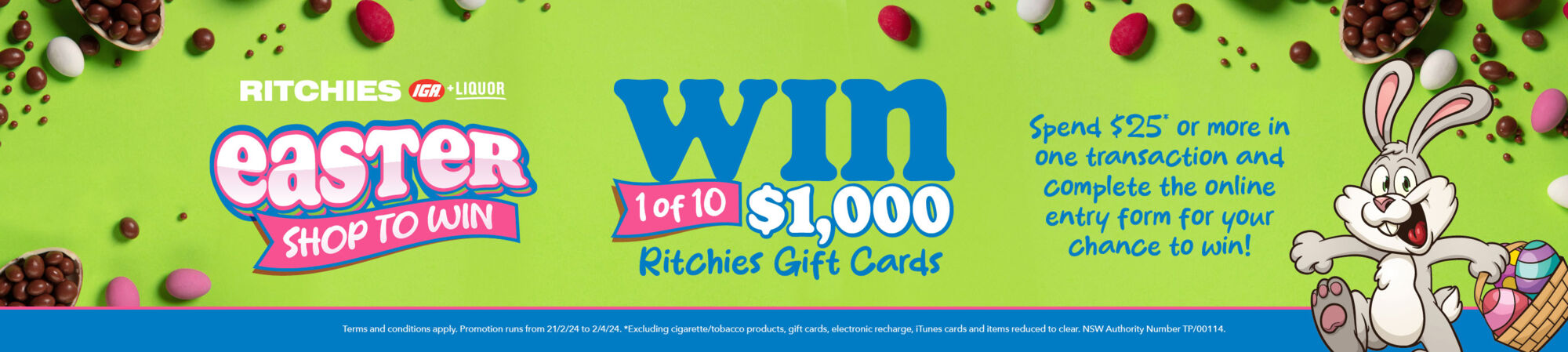 www.ritchies.com.au/easter within 5 business days of the draw. Prize will be made available for collection at the winners nearest Ritchies Supermarket.