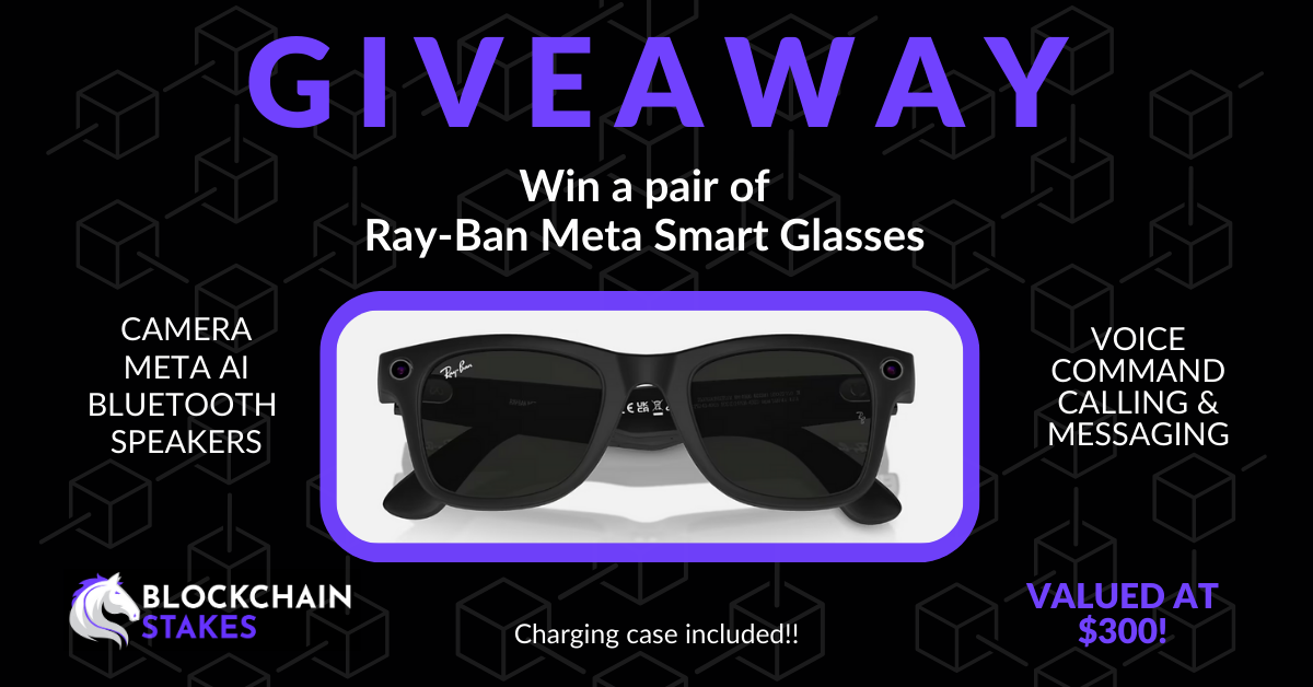 🎉 Get ready for the ultimate tech giveaway from Blockchain Stakes! 🚀 We're thrilled to announce that we'll be giving away a pair of Ray-Ban Meta Smart Glasses valued at $300! 😎✨