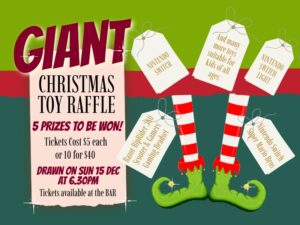 Get your raffle tickets for the Giant Christmas Toy Raffle at the bar! Tickets are $5 each or 10 for $40. With over $5,000 worth of toys up for grabs, don’t miss out! The raffle will be drawn on Sunday, 15th December at 6:30pm