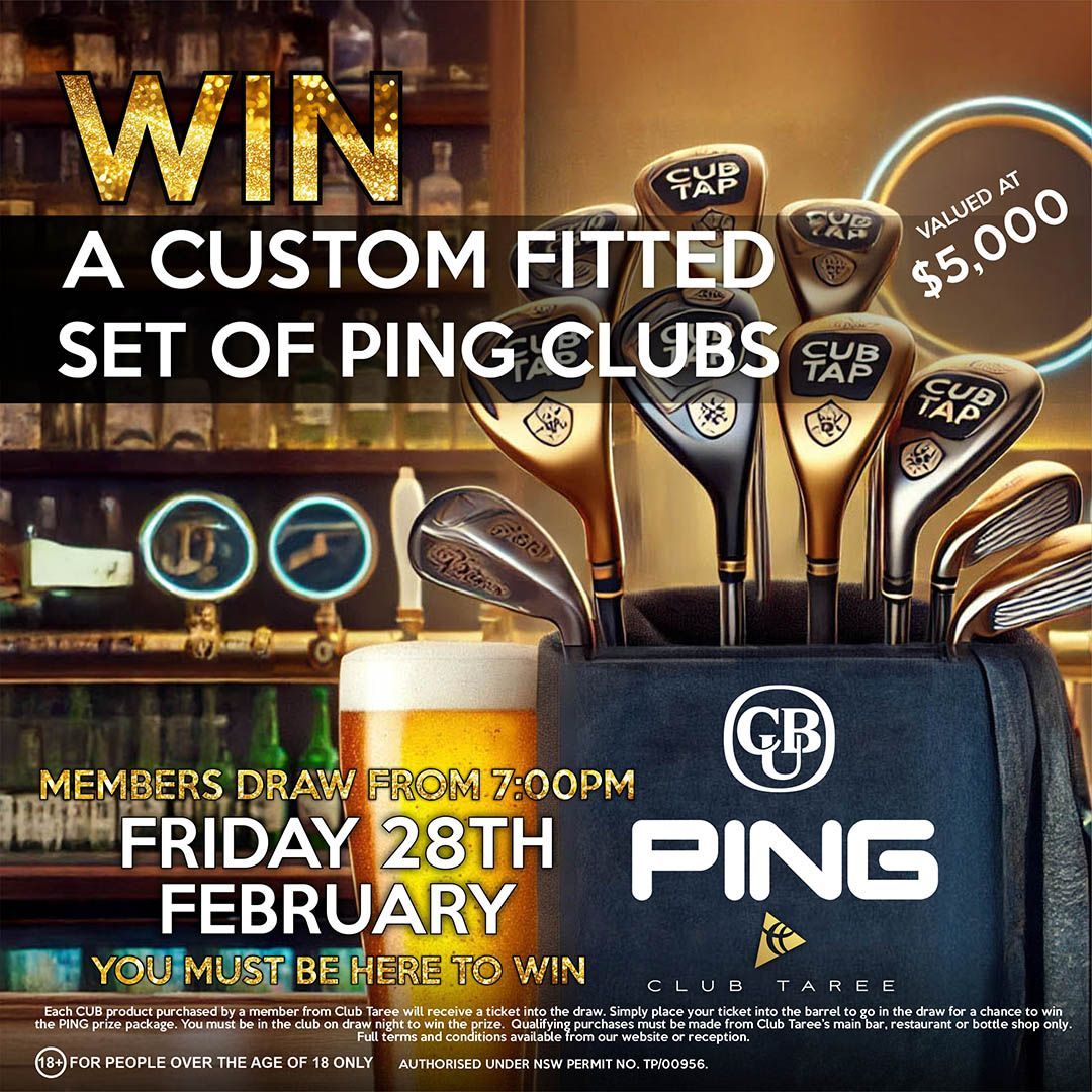 Each CUB product purchased by a member from Club Taree will receive a ticket into the draw. Simply place your ticket into the barrel to go in the draw for a chance to win the PING prize package. You must be in the club on draw night to win the prize. Qualifying purchases must be made from Club Taree’s main bar, restaurant or bottle shop only. Full terms and conditions available from our website or reception. Starts: 11th December 2024 Drawn: 28th February 2025 YOU MUST BE AT THE DRAW TO CLAIM YOUR PRIZE AUTHORISED UNDER NSW PERMIT NO. TP/00956.