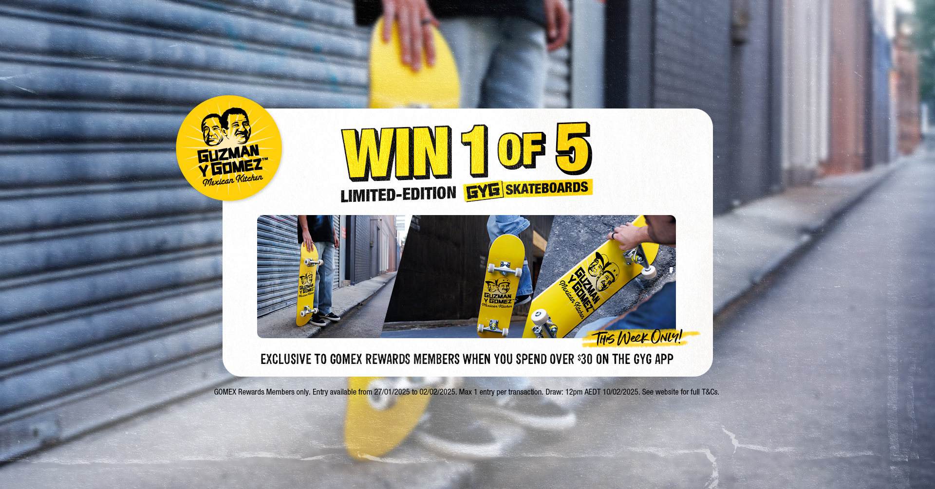 GOMEX Rewards Members only. Entries available from 06.01.2025 to 02.03.2025. Max 1 entry per transaction by spending $30 on a single transaction on the GYG App. Four unique prize types over the duration of the competition. Winners drawn on the 10/02/2025. Click here for full competition terms & conditions.