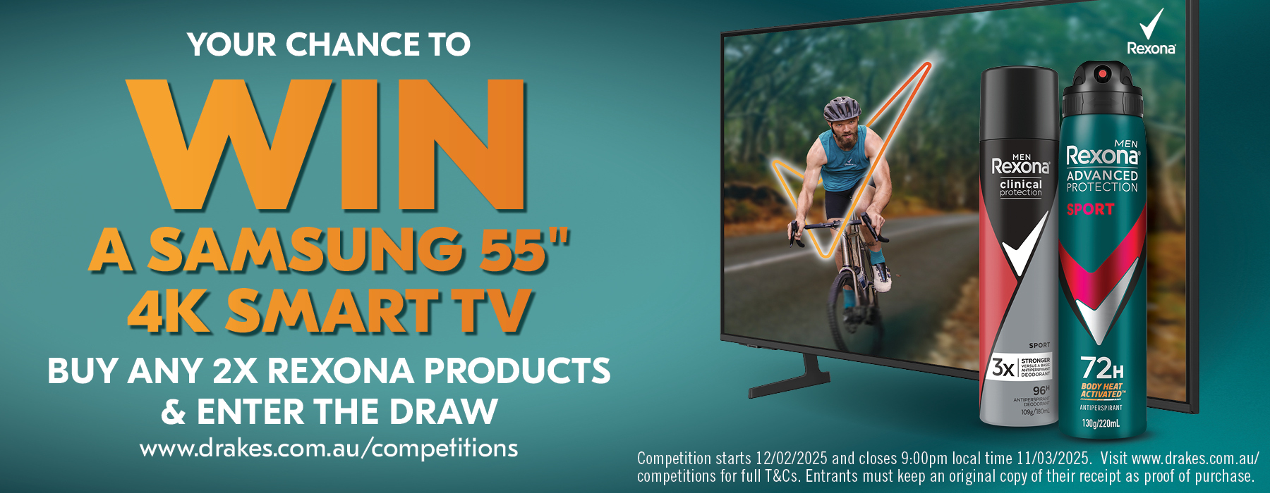 Simply purchase any TWO Rexona products in the one transaction at any participating Drakes during the promotional period for your chance to win. Promotion commences 12/02/2025 and closes 9:00pm AEST 11/03/2025.