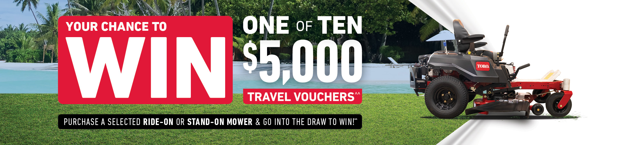 Purchase a selected Toro ride-on or stand-on mower at an independent participating authorised Toro dealer between 1 January and 31 March 2025 for your chance to enter the draw to win 1 of 10 $5000 travel vouchers^^. Fill out the form below to go into the draw to win.