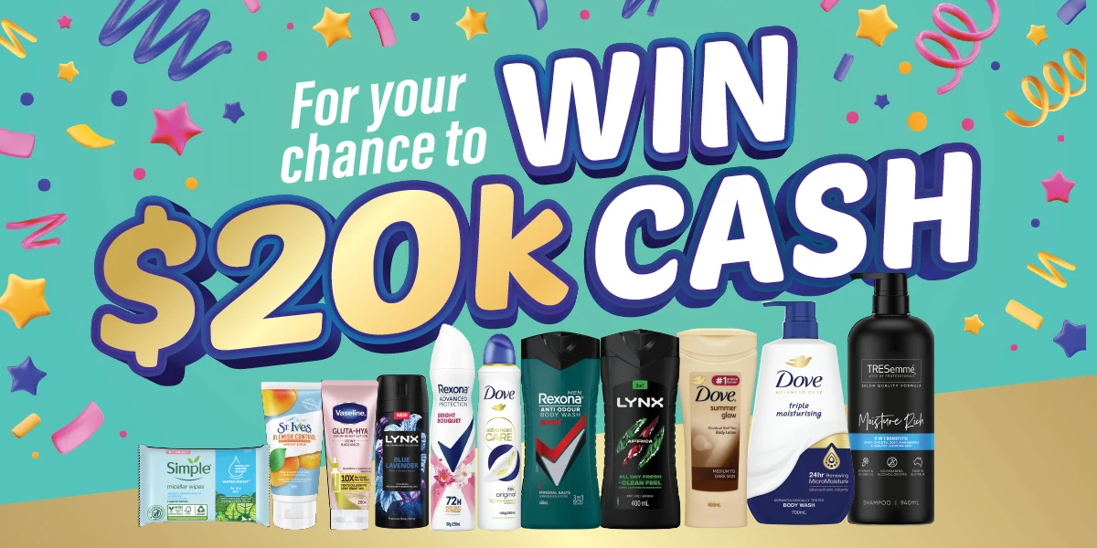 Spend $20 or more on participating brands (Rexona, Dove, Lynx, Vaseline, Tresemme, Simple, St Ives, Radox, Liquid I.V) for your chance to win $20,000.