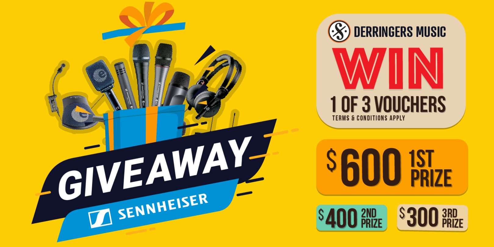 https://derringers.com.au/sennheiser-giveawayThe Sennheiser $1300 Sweepstakes competitions comprises of a total prize pool of $1300, divided into 3 prize categories, first, second, and third. 1st Prize is $600, 2nd Prize is $400, 3rd Prize is $300. Amount is to be spent on Sennheiser products available from Derringers Music.