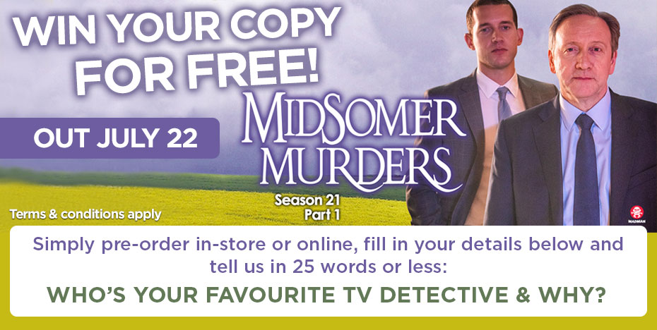 To enter the Promotion, Eligible Persons must, within the Promotional Period, pre-order Midsomer Murders Season 21 Part 1 (Cat# MMTV0111) at any Sanity store or online at sanity.com.au, then on the competition page they must enter their full name, address, store receipt number OR 16 digit order confirmation number, and a 25 words or less answer to the question “Who’s your favourite TV detective and why?”