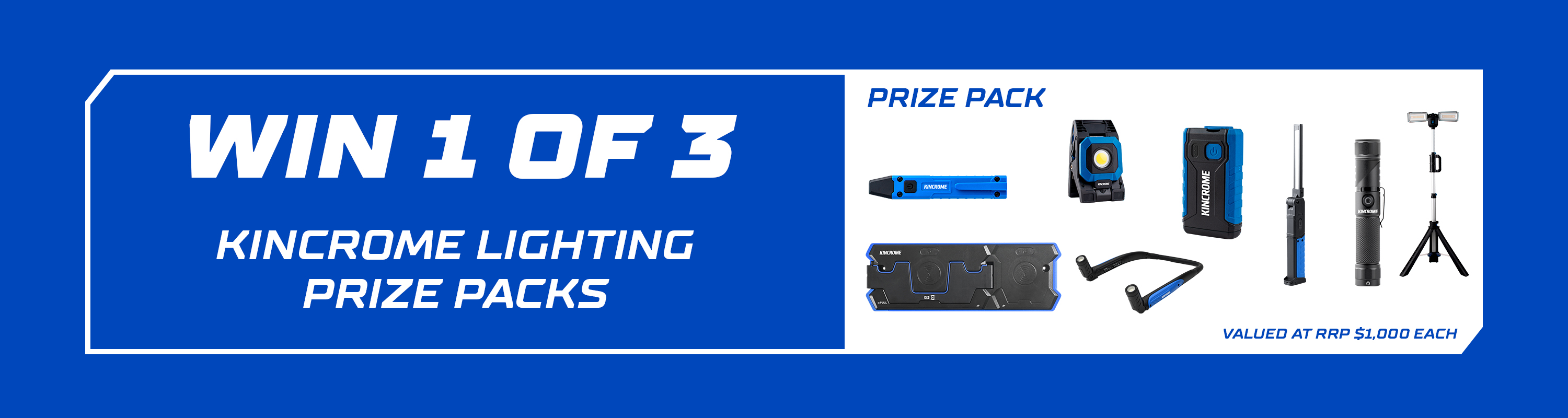 Prizes: 3 x Kincrome Lighting Prize Packs* (valued at RRP $1000 each), each containing: