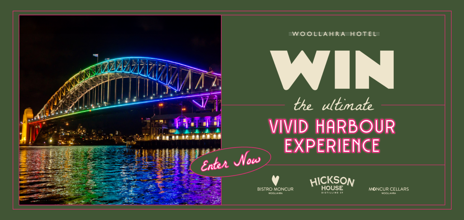 Complete details on the online form via the Woollahra Hotel website: https://www.woollahrahotel.com.au/hickson-house-vivid-giveaway/