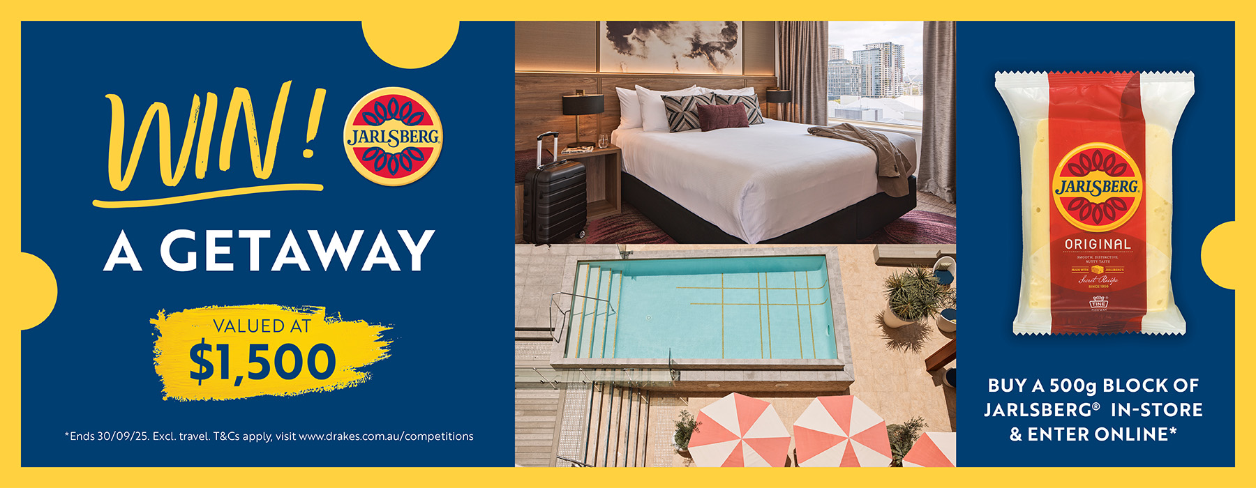 Simply purchase one x 500g block of Jarlsberg Cheese from the dairy section (APN number 9310631628445) in the one transaction in-store at any Queensland Drakes Supermarkets between 3rd September and 30th September 2025 for your chance to win.