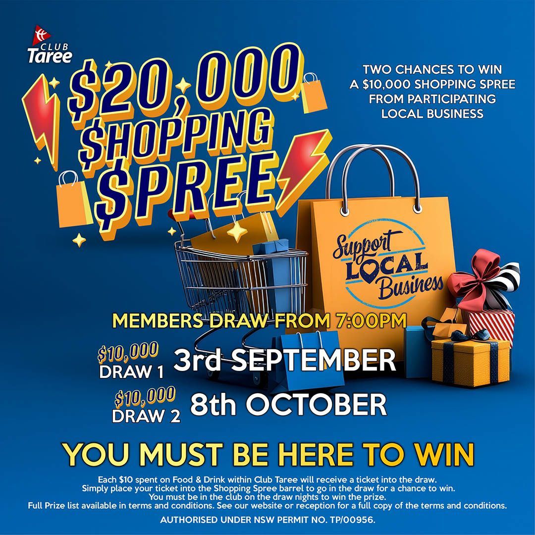 TWO CHANCES TO WIN A $10,000 SHOPPING SPREE FROM PARTICIPATING LOCAL BUSINESS Each $10 spent on Food & Drink within Club Taree will receive a ticket into the draw. Simply place your ticket into the Shopping Spree barrel to go in the draw for a chance to win. You must be in the club on the draw nights to win the prize. Full Prize list available in terms and conditions. See our website or reception for a full copy of the terms and conditions. $10,000 Draw 1 : 3rd SEPTEMBER 2025 from 7pm $10,000 Draw 2 : 8th OCTOBER 2025 from 7pm YOU MUST BE HERE TO WIN AUTHORISED UNDER NSW PERMIT NO. TP/00956.