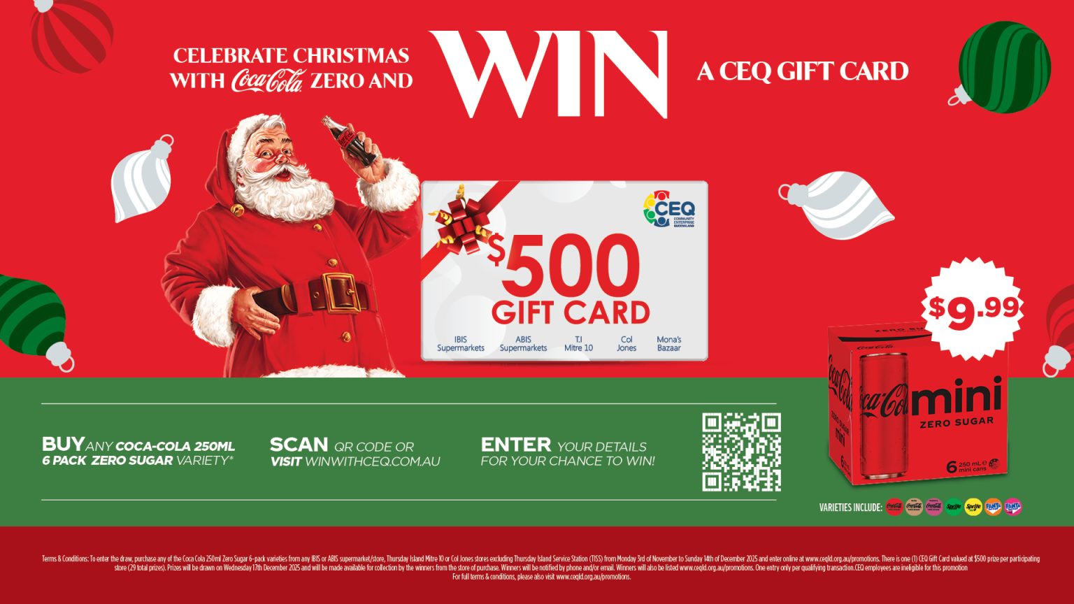 To enter the draw, purchase any of the Coca Cola 250ml Zero Sugar 6-pack varieties from any IBIS or ABIS supermarket/store, Thursday Island Mitre 10 or Col Jones stores excluding Thursday Island Service Station (TISS) from 3rd November to 14th December 2025, and enter online at